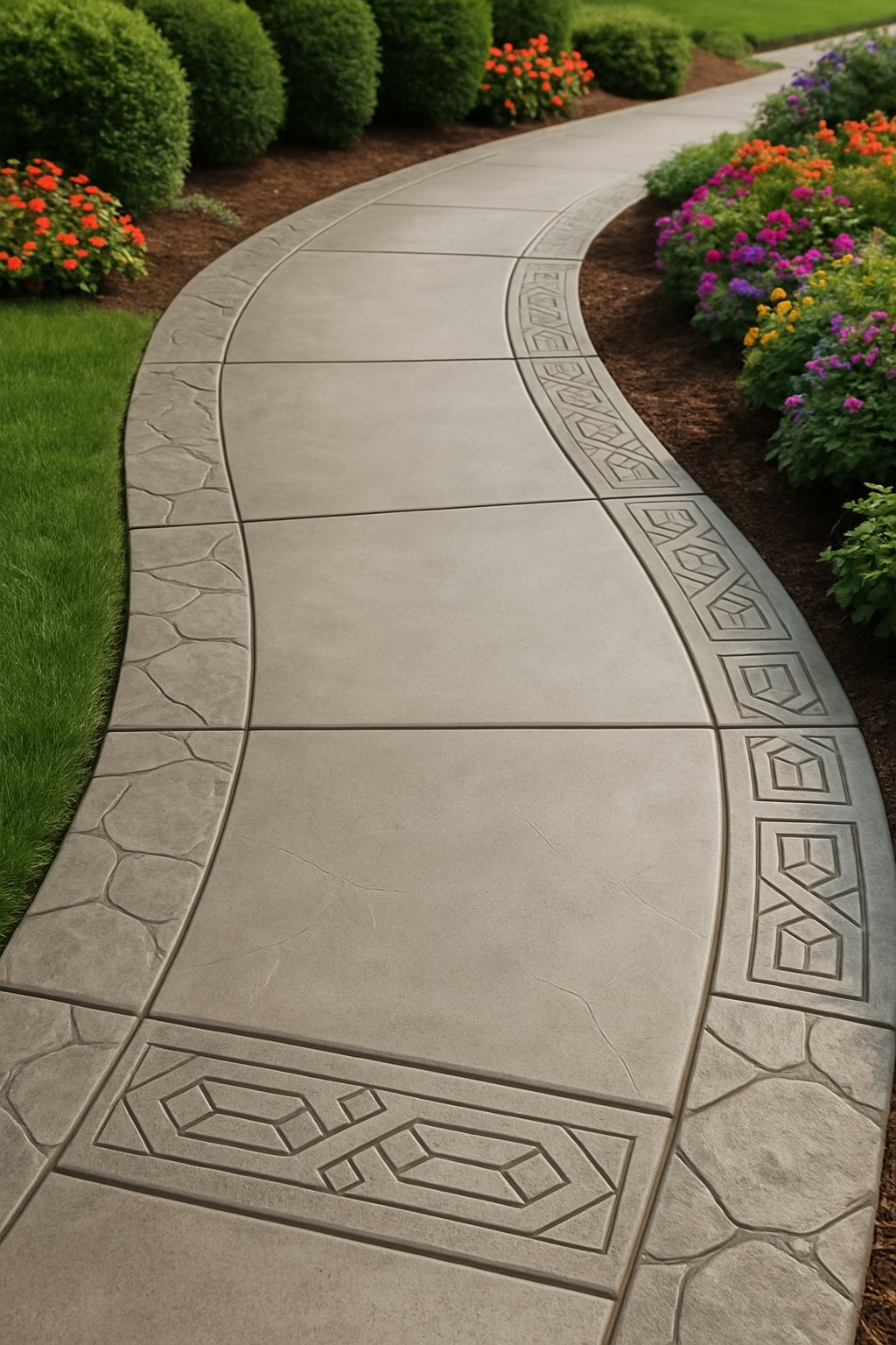 A smooth, poured concrete walkway with stamped designs offers a clean and finished appearance. You can press patterns that mimic stone, brick, or even wood into the concrete while it’s still wet. This method adds personality and style while maintaining a smooth surface. Stamped concrete is often more affordable than authentic stone or brick but can achieve a similar aesthetic. It’s also easier to clean and maintain. There are numerous design and color options available to match your home’s style perfectly. Planting flowers or greenery along the edges can soften the hard surface, making the area feel more welcoming. A curved stamped concrete walkway can also introduce playful shapes into your yard. To protect the surface and preserve its color, seal your stamped concrete every few years and choose colors that complement your home’s exterior.