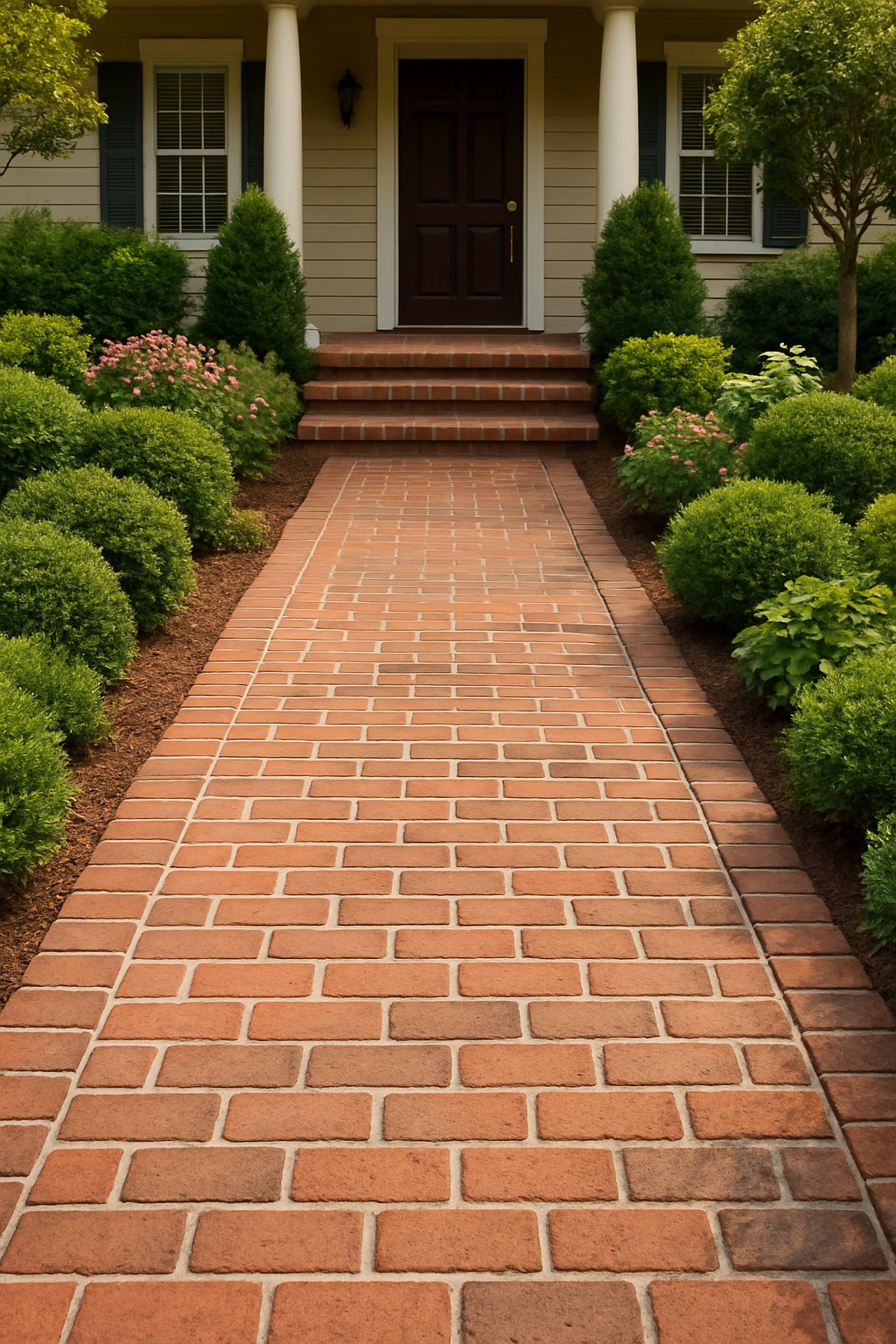 A clay brick walkway gives your front yard a warm, classic feel that blends well with most home styles. To soften the hard lines of the brick, consider adding ivy along the edges. Ivy grows close to the ground, fills in gaps, and can even trail over the sides for a lush, inviting appearance. The contrast between the red or tan bricks and the vibrant green ivy is particularly striking. Just be sure to trim the ivy occasionally to prevent it from overgrowing the path. Clay bricks are known for their durability and ability to withstand the elements. When planting, space the ivy a few inches apart to allow it to spread naturally over time. It’s best to choose a slow growing ivy variety to avoid constant upkeep and water it regularly in the first year to help it get established.