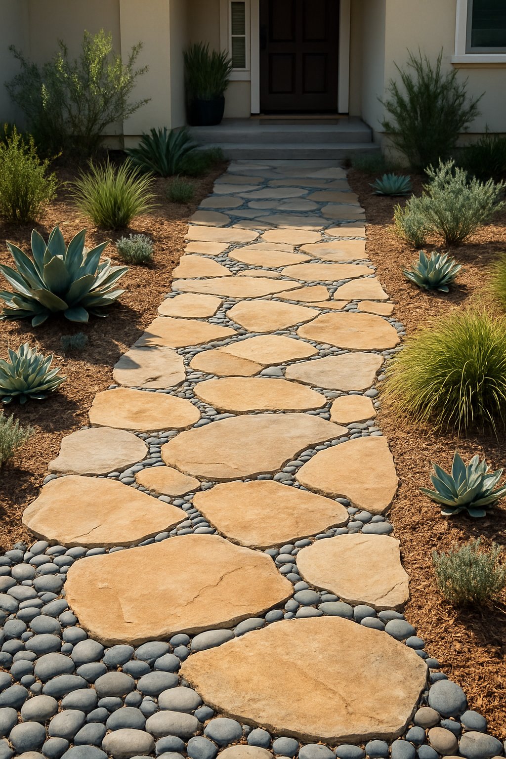Mixing flagstones with small pebbles creates a visually appealing walkway with great texture. The pebbles not only look good but also help with water drainage around the larger stones. Along the edges, consider planting drought tolerant options like succulents, agave, or tough ornamental grasses. These plants require minimal water and complement the stone aesthetic perfectly. Using pebbles around the base of the plants can help the soil retain moisture and keep weeds at bay, maintaining a tidy appearance. You can add extra height and interest by building small raised beds or stone tiers. This also allows you to separate different plant types for more variety. Make sure the walkway is wide enough for comfortable passage and avoid planting too close to the stones to keep the path clear. Choosing plants with different shapes and heights will add depth to the design.