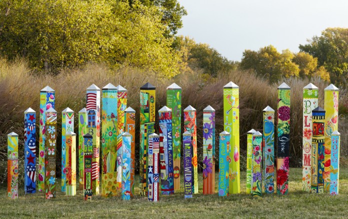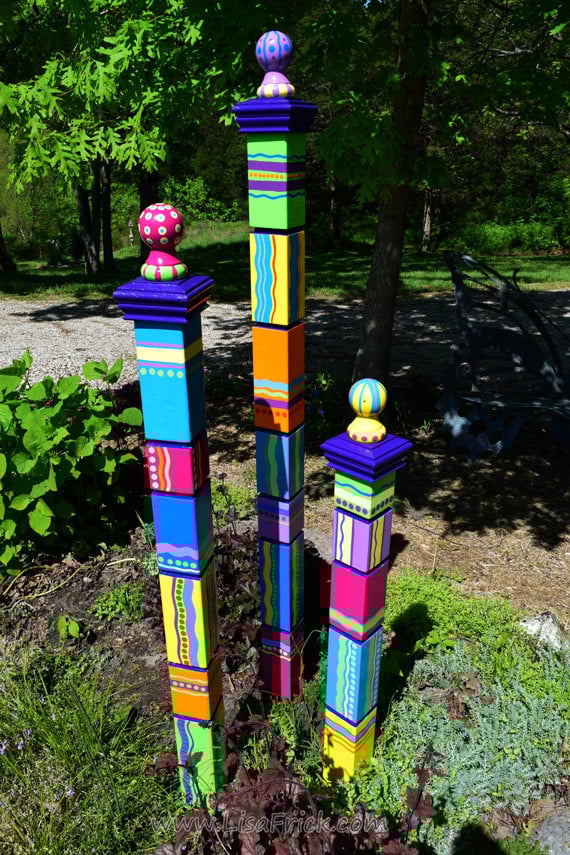 These vividly painted wooden garden totems introduce a fantastic burst of color into any garden setting.