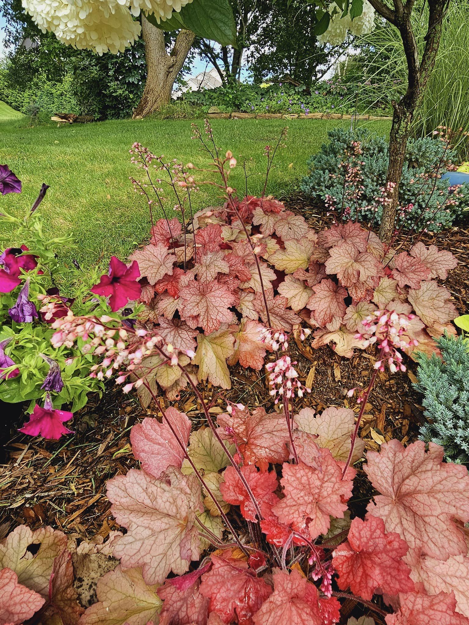 Coral Bells thrive in partial to full shade and prefer well draining soil, as soil that is too wet can cause root rot. In terms of looks, these plants’ most distinctive feature is their foliage, but they also produce slender stems with small, bell shaped flowers from spring to early summer.