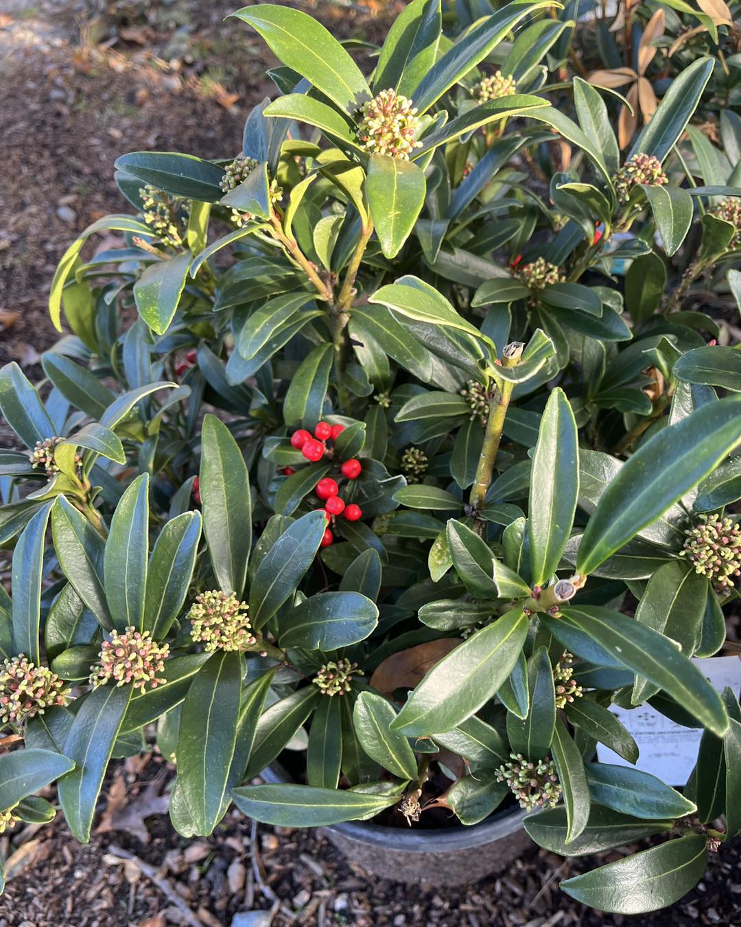 If you are looking to add color to the areas under your trees, you cannot go wrong with Japanese Skimmia. This evergreen shrub features green, glossy, leathery leaves.