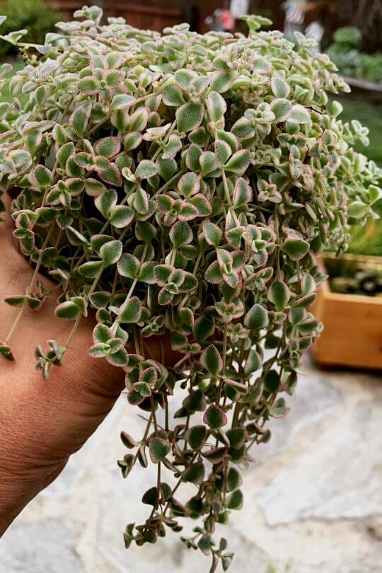 Another visually stunning succulent for your drought tolerant hanging garden is the Calico Kitten, or Crassula pellucida Variegata.