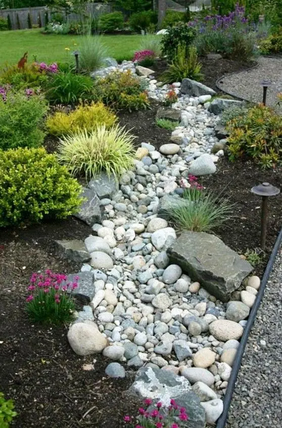 You can edge your new riverbed with larger white rocks. This feature not only looks incredible but is also a clever solution for managing drainage issues in your yard.